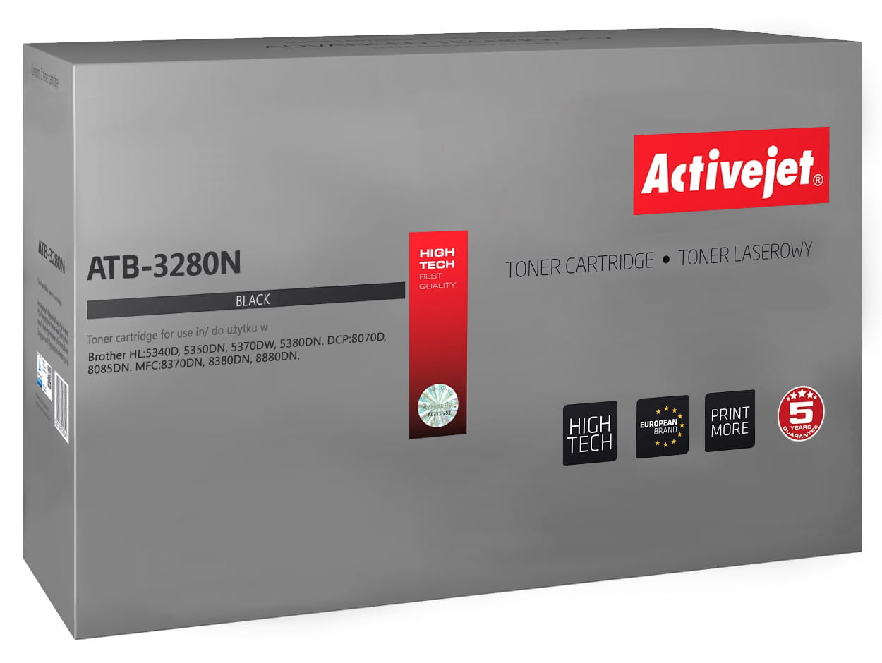 Toner firmy ActiveJet oryginalnie zapakowany w folię ochronną i pudełko.