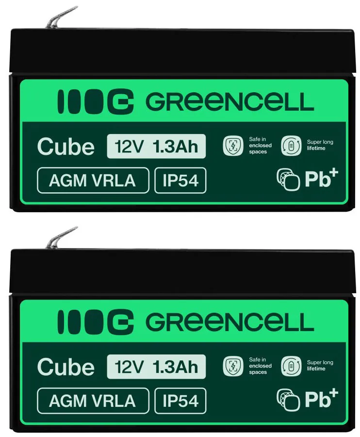 - Dwa akumulatory firmy Green Cell AGM VRLA 12V 1.3Ah