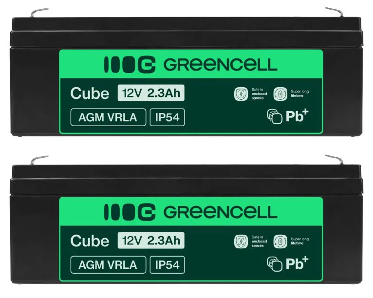 - Dwa akumulatory firmy Green Cell AGM VRLA 12V 2.3Ah