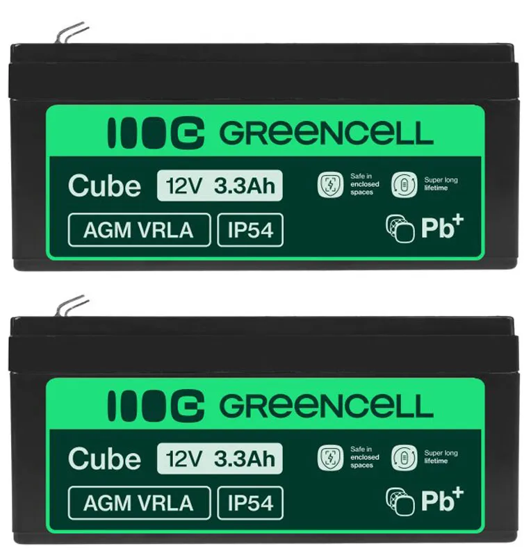 - Dwa akumulatory firmy Green Cell AGM VRLA 12V 3.3Ah