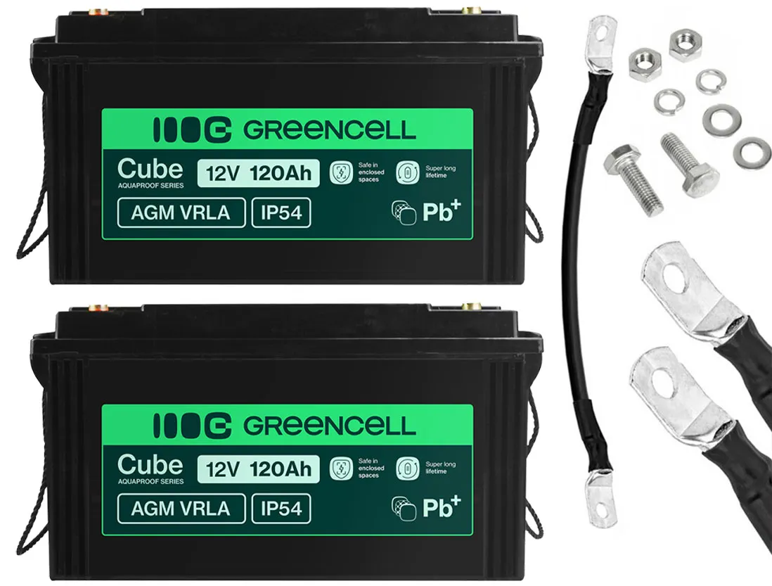 - Dwa akumulatory firmy Green Cell Cube AGM VRLA IP54 12V 120Ah