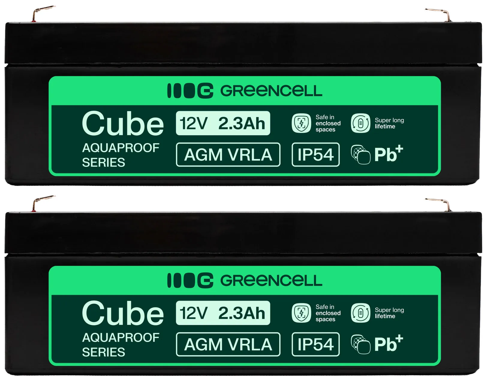 - Dwa akumulatory firmy Green Cell Cube AGM VRLA IP54 12V 2.3Ah