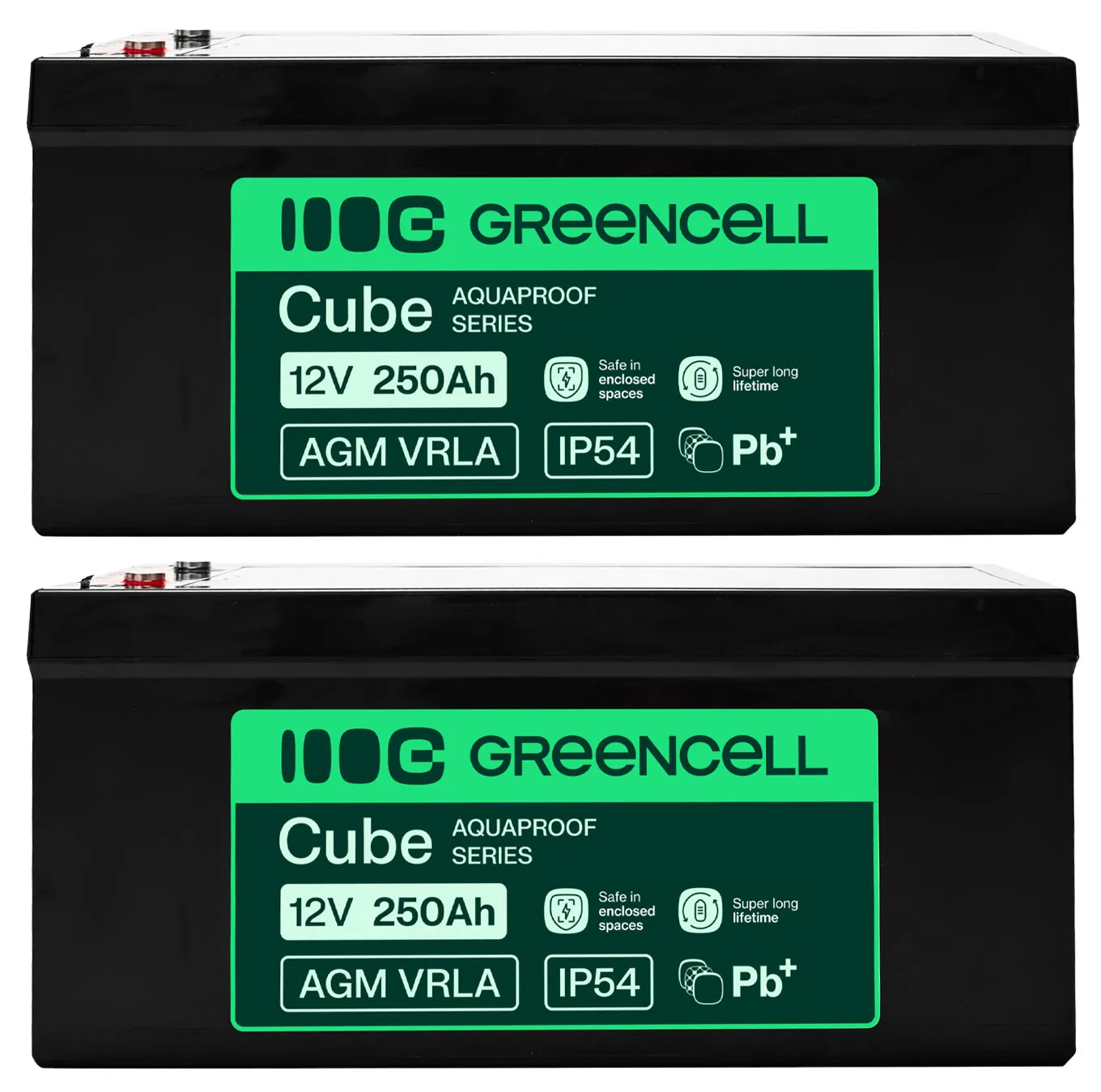 - Dwa akumulatory firmy Green Cell Cube AGM VRLA IP54 12V 250Ah