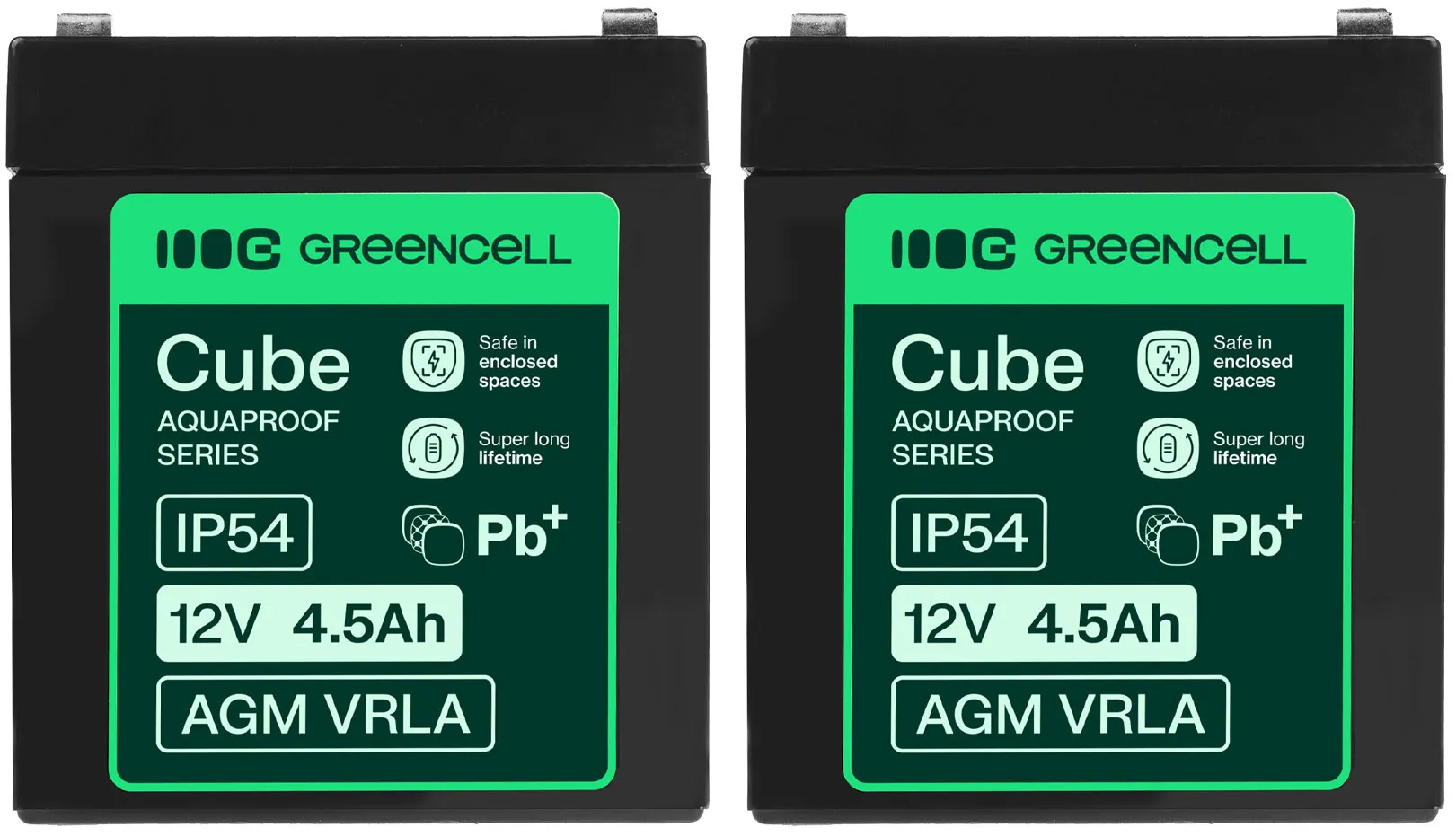 - Dwa akumulatory firmy Green Cell Cube AGM VRLA IP54 12V 4.5Ah