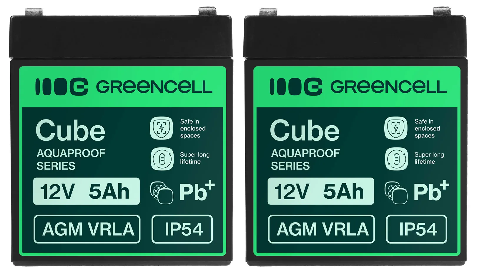 - Dwa akumulatory firmy Green Cell Cube AGM VRLA IP54 12V 5Ah