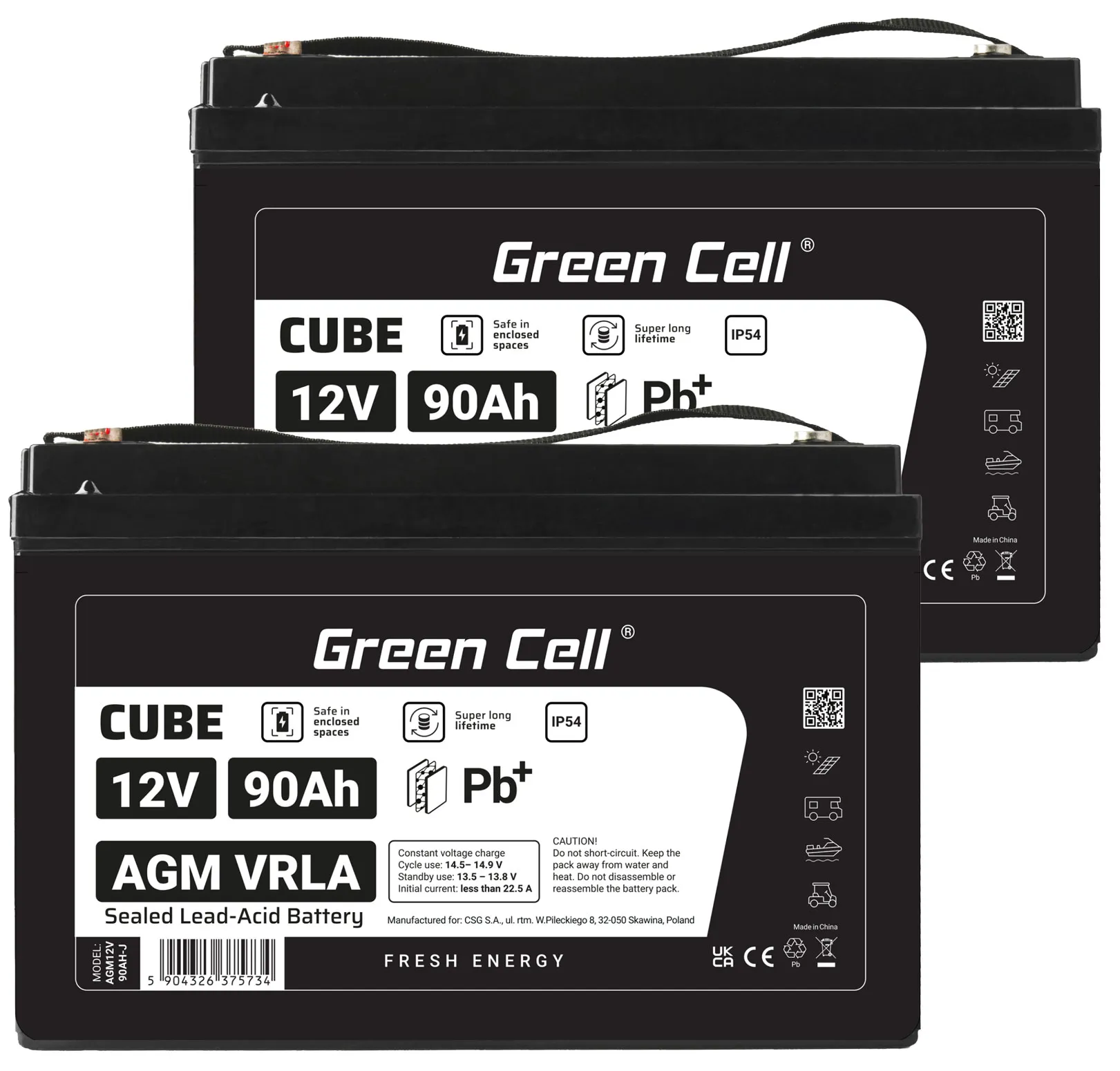 - Dwa akumulatory firmy Green Cell Cube AGM VRLA IP54 12V 90Ah