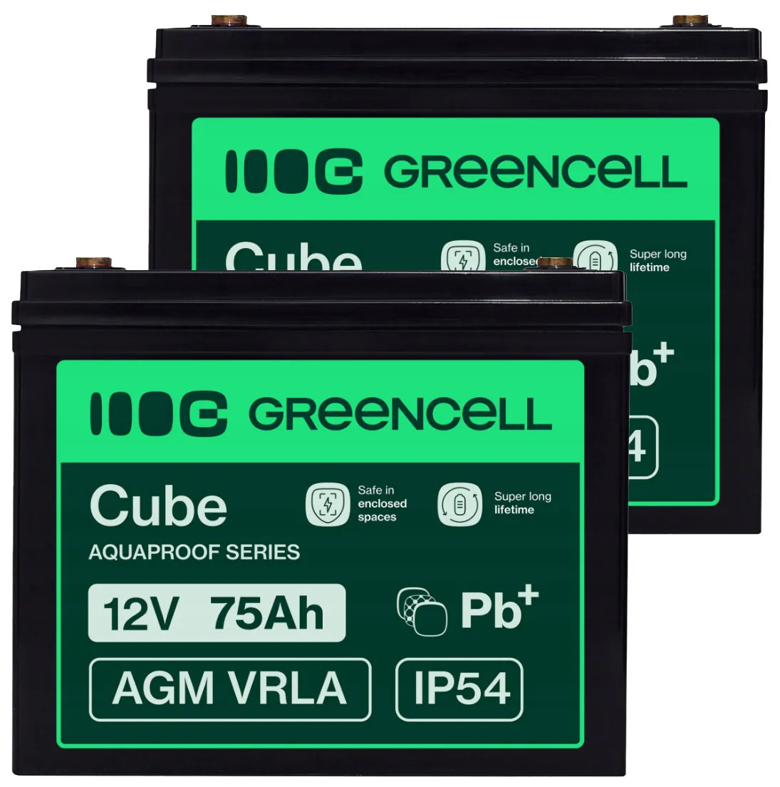 - Dwa akumulatory firmy Green Cell Cube AGM VRLA IP54 12V 75Ah