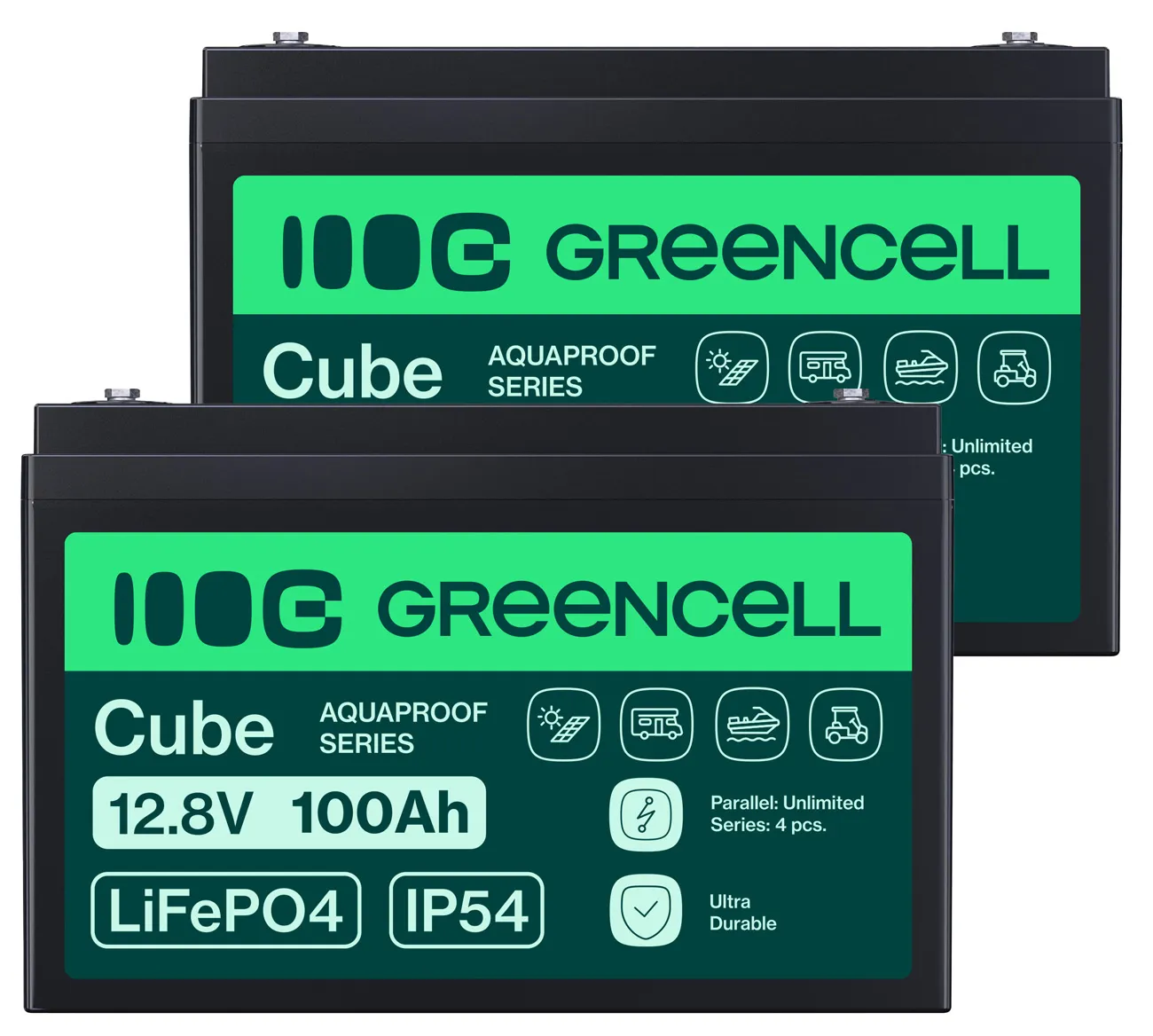 - Dwa akumulatory firmy Green Cell Cube LiFePO4 100Ah 12.8V 1280Wh