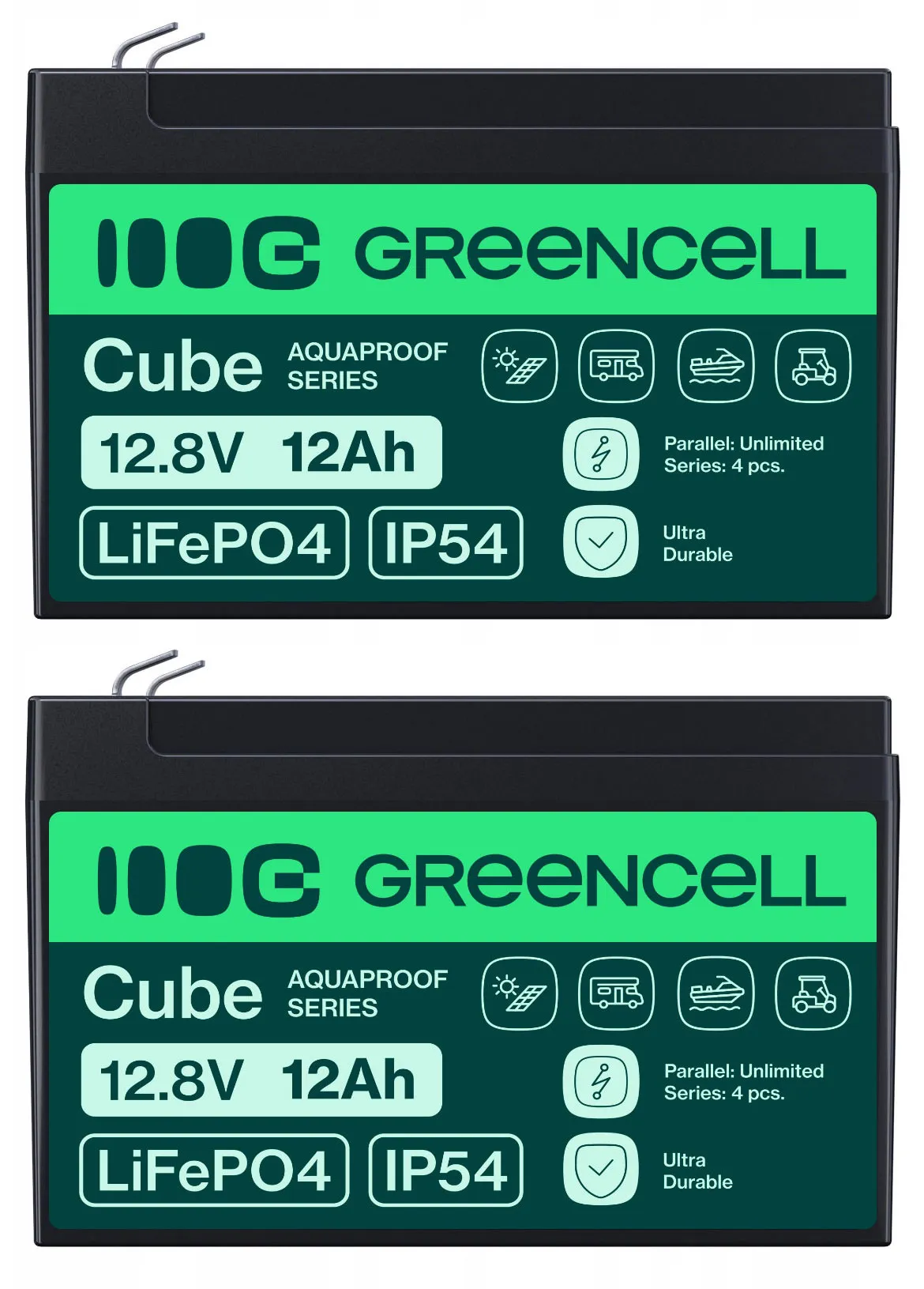 - Dwa akumulatory firmy Green Cell LiFePO4 12Ah 12.8V 153,6Wh