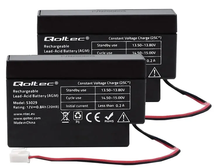 - Dwa akumulatory firmy Qoltec AGM LongLife 12V 0.8Ah