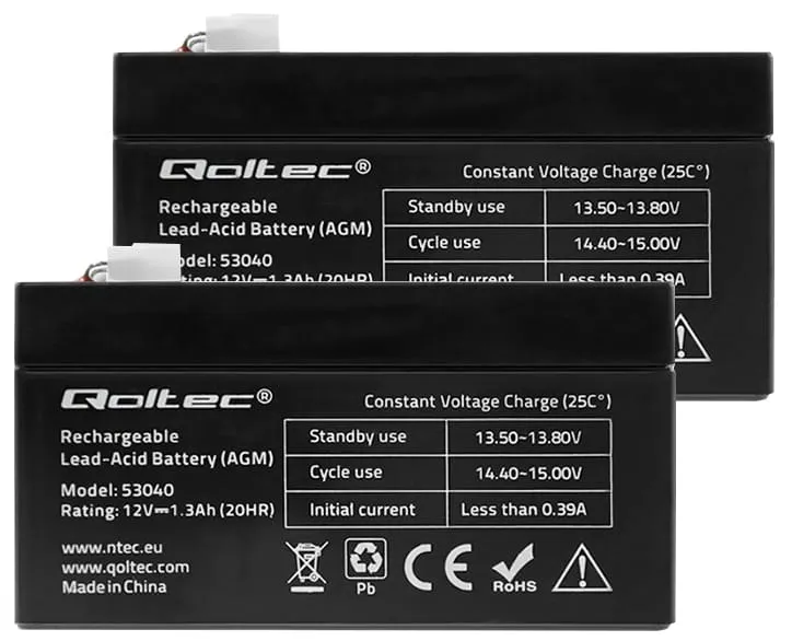- Dwa akumulatory firmy Qoltec AGM LongLife 12V 1.3Ah