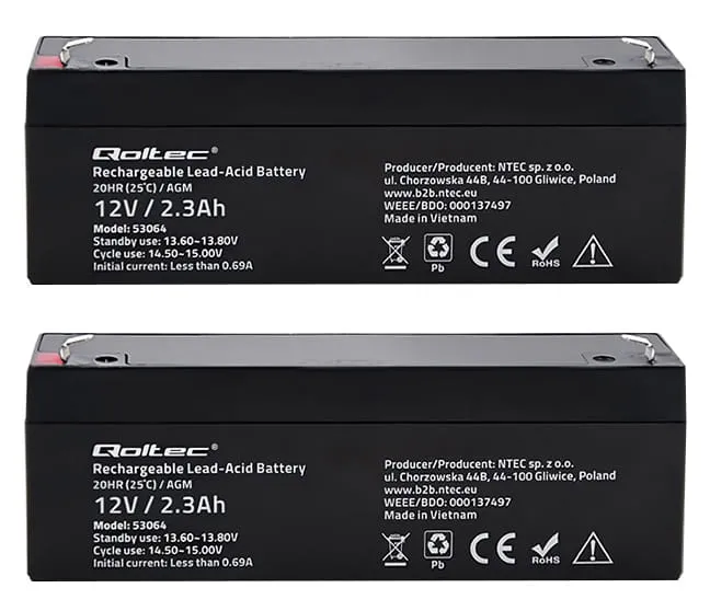 - Dwa akumulatory firmy Qoltec AGM LongLife 12V 2.3Ah