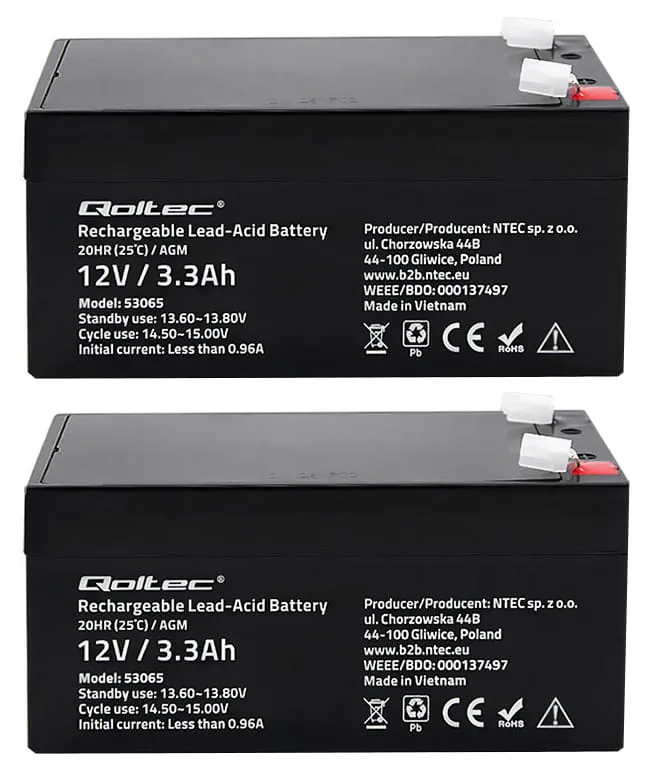 - Dwa akumulatory firmy Qoltec AGM LongLife 12V 3.3Ah