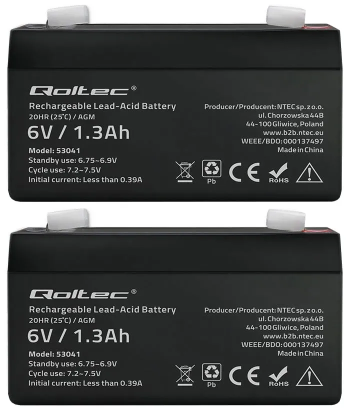 - Dwa akumulatory firmy Qoltec AGM LongLife 6V 1.3Ah