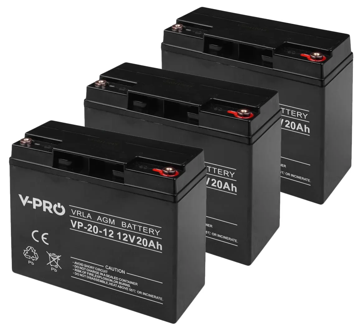 Zestaw trzech akumulatorów firmy Volt Polska VPRO VRLA AGM 12V 20Ah do pojazdów z napędem elektrycznym, systemów zasilania awaryjnego (UPS, systemy automatyki), instalacji fotowoltaicznych, czy przetwornic napięcia. Najlepiej sprawdza się w układach ładowania buforowego.