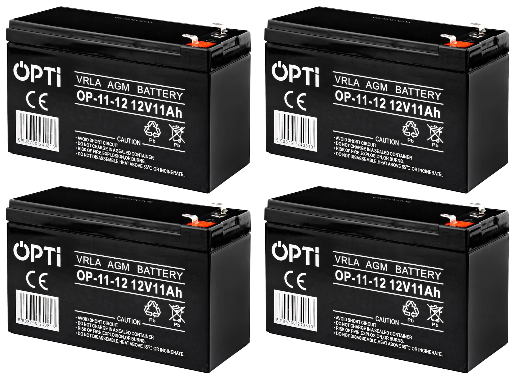 Zestaw czterech akumulatorów firmy Volt Polska OPTI VRLA AGM 12V 11Ah do pojazdów z napędem elektrycznym, systemów zasilania awaryjnego (UPS, systemy automatyki), instalacji fotowoltaicznych, czy przetwornic napięcia. Najlepiej sprawdza się w układach ładowania buforowego.