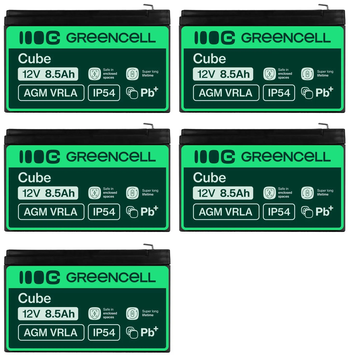 - Pięć akumulatorów firmy Green Cell AGM VRLA 12V 8.5Ah