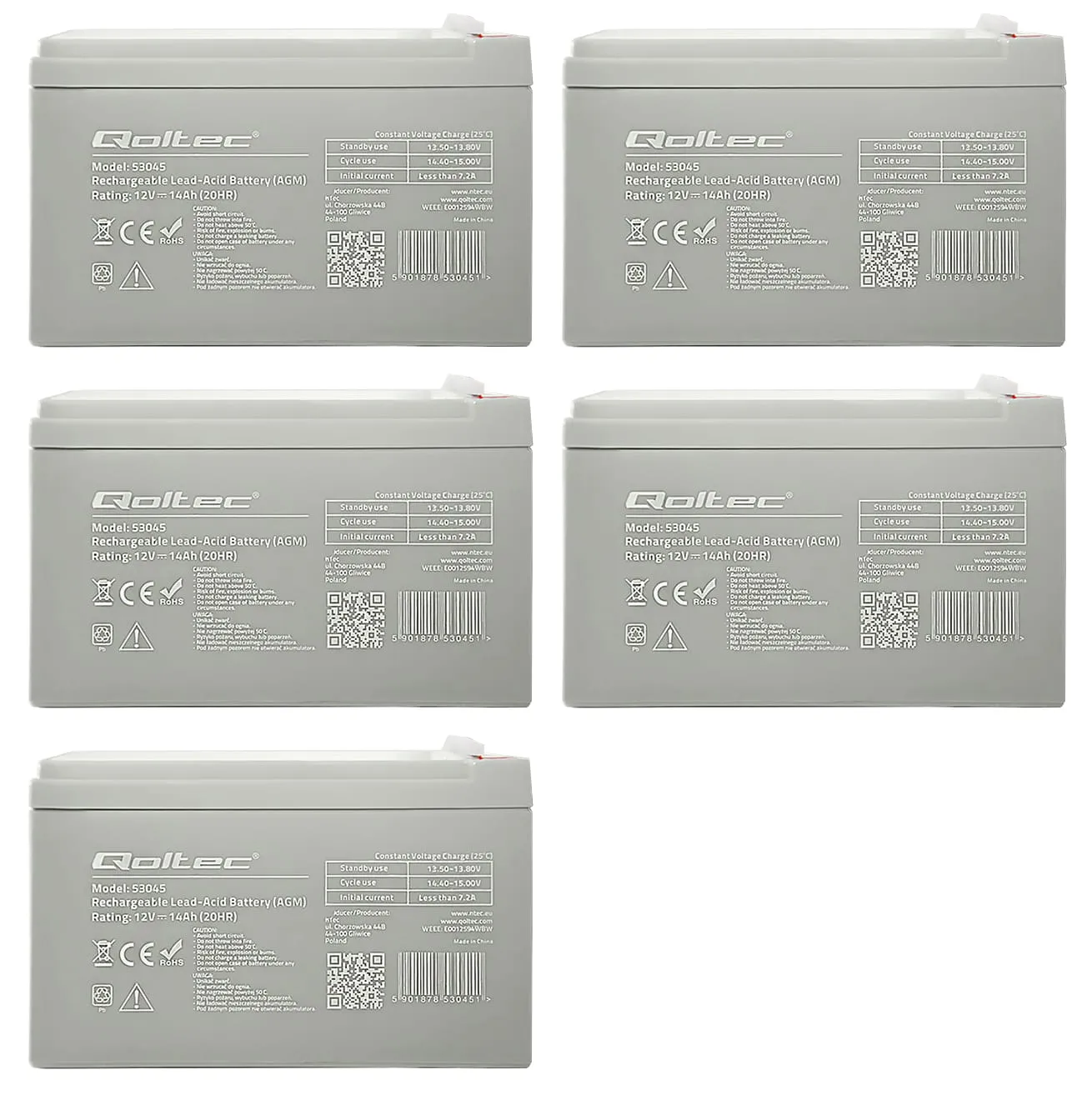 - Pięć akumulatorów firmy Qoltec AGM LongLife 12V 14Ah