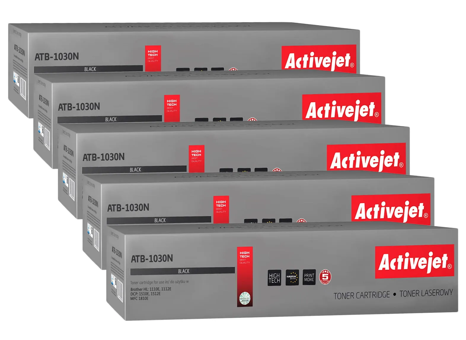 Pięć tonerów firmy ActiveJet oryginalnie zapakowany w folię ochronną i pudełko.