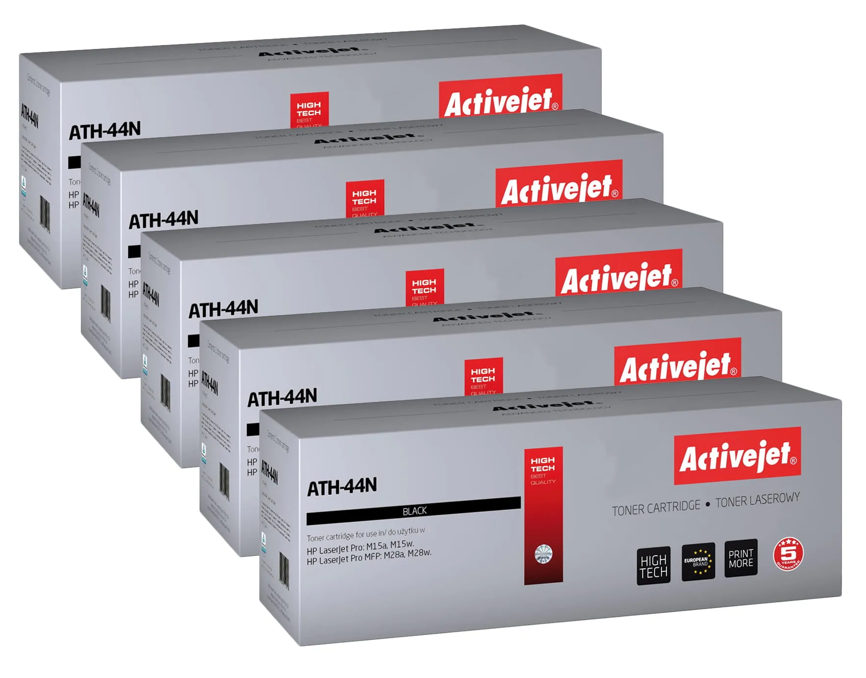 Pięć tonerów firmy ActiveJet oryginalnie zapakowany w folię ochronną i pudełko.