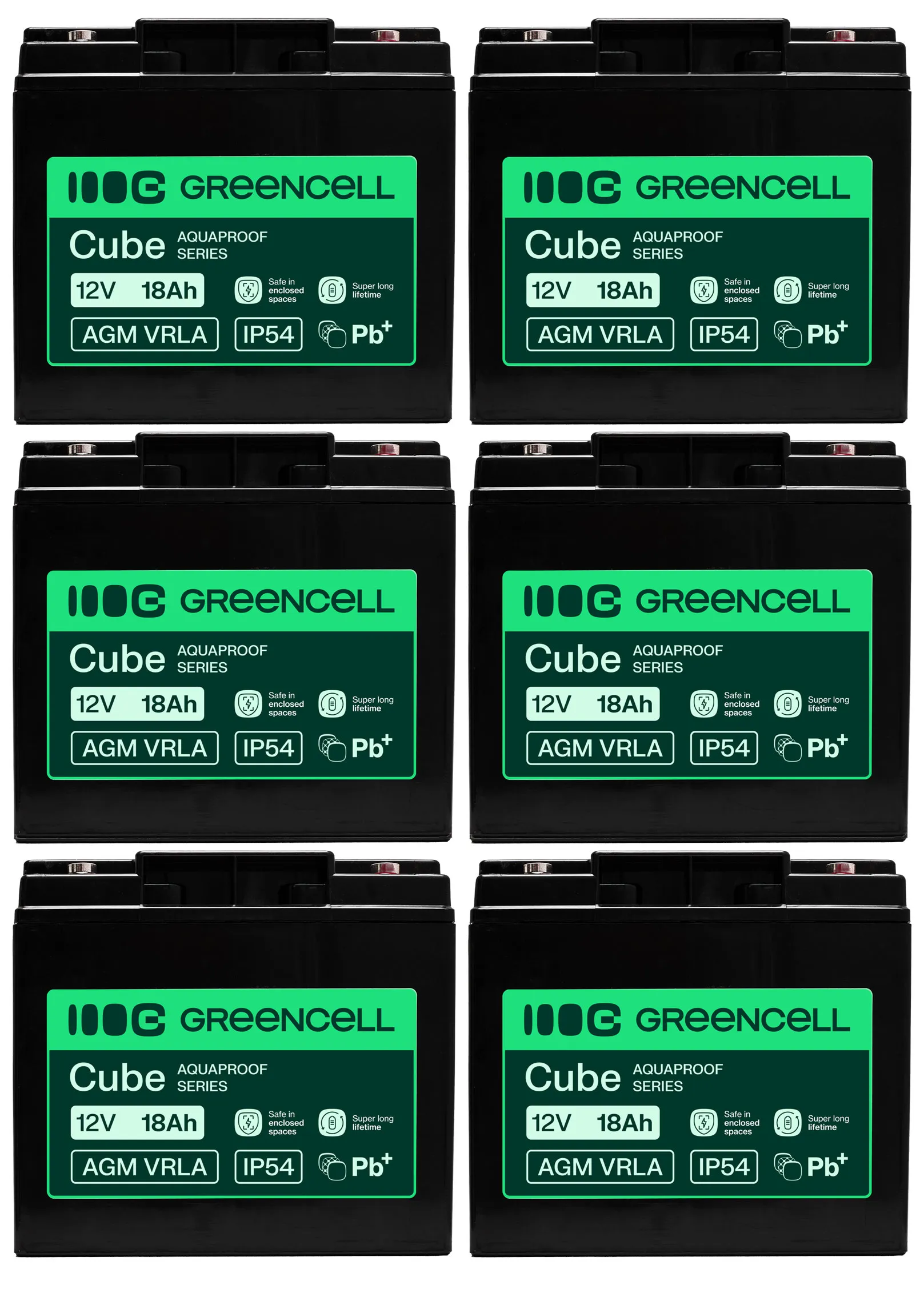 - Sześć akumulatorów firmy Green Cell Cube AGM VRLA IP54 12V 18Ah