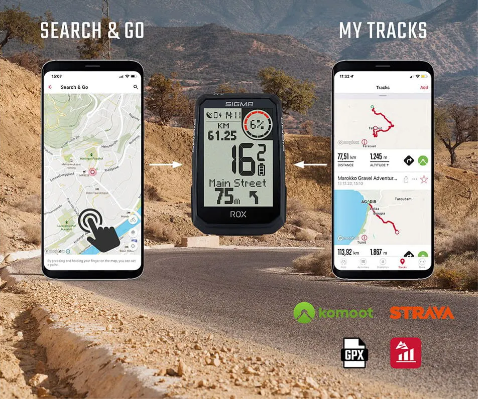 Dzięki „nawigacji Search & Go” można szybko znaleźć dowolną lokalizację, a następnie wyznaczyć do niej trasę. W tym celu trzeba wprowadzić adres w aplikacji SIGMA RIDE na smartfonie lub kliknąć dowolny punkt na mapie. Istnieje możliwość indywidualnego definiowania preferencji dotyczących dróg (ścieżki rowerowe, nieutwardzone drogi, zwykłe drogi oraz ścieżki piesze / szlaki turystyczne). Utworzoną trasę można bezpośrednio uruchomić na komputerze ROX 4.0 ENDURANCE lub zapisać do późniejszego wykorzystania w aplikacji RIDE.