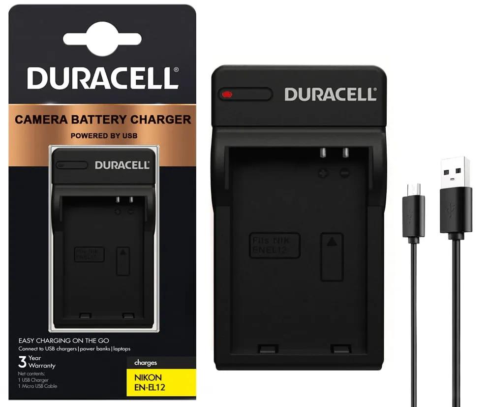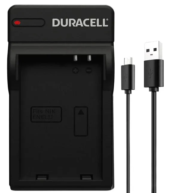 Ładowarka DRN5923 marki Duracell zasilana za pomocą przewodu USB. Współpracuje z zamiennikami oraz oryginalnymi bateriami EN-EL12. W zestawie z ładowarką znajduje się kabel USB-A/microUSB. Producent wyposażył ją w diodę, która może świecić na czerwono lub zielono. Dzięki temu akcesorium łatwo informuje o stanie ładowania baterii.