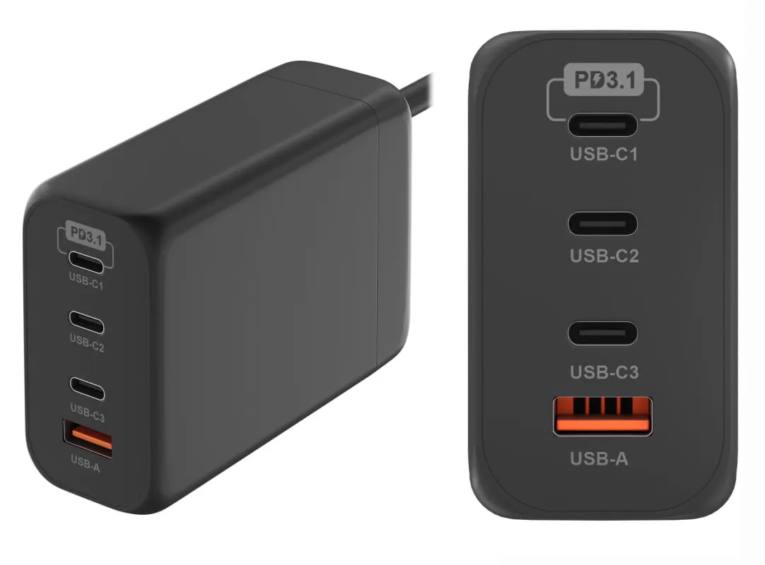 Na pokładzie znajdziemy 3 porty USB-C oraz 1 port USB-A. Wariant EU z wtyczką "europlug" gwarantuje kompatybilność z niemal wszystkimi europejskimi gniazdkami. Ładowarka obsługuje napięcie od 100 do 240 V i częstotliwości 50-60 Hz, co sprawia, że może być używana na całym świecie.