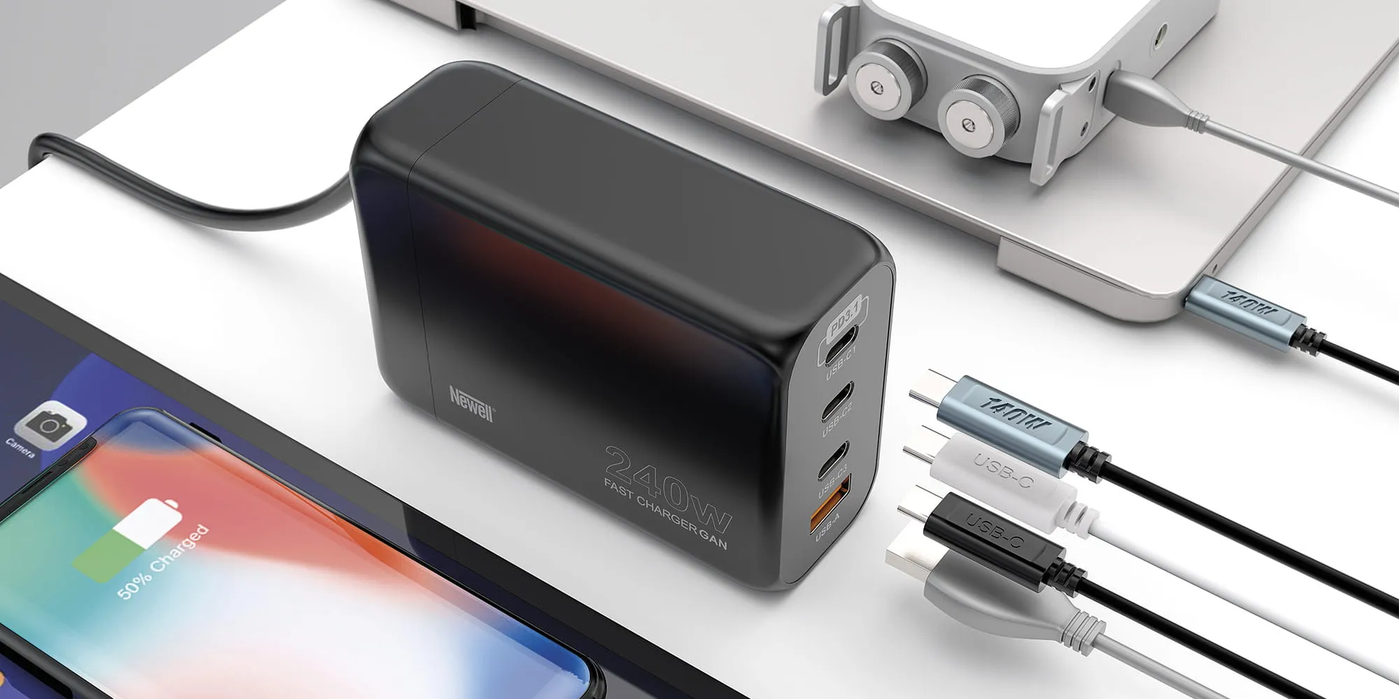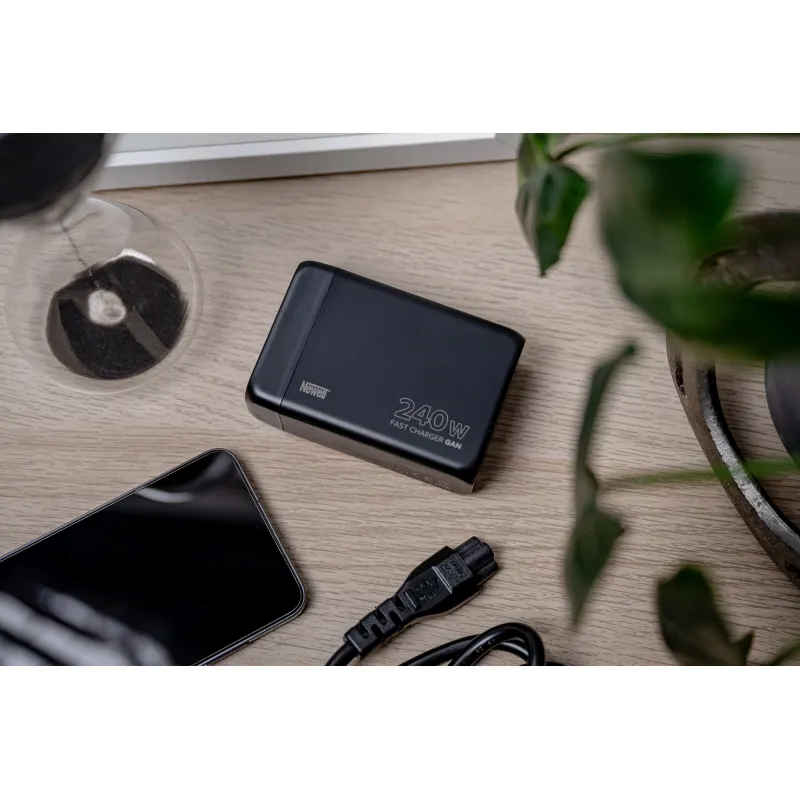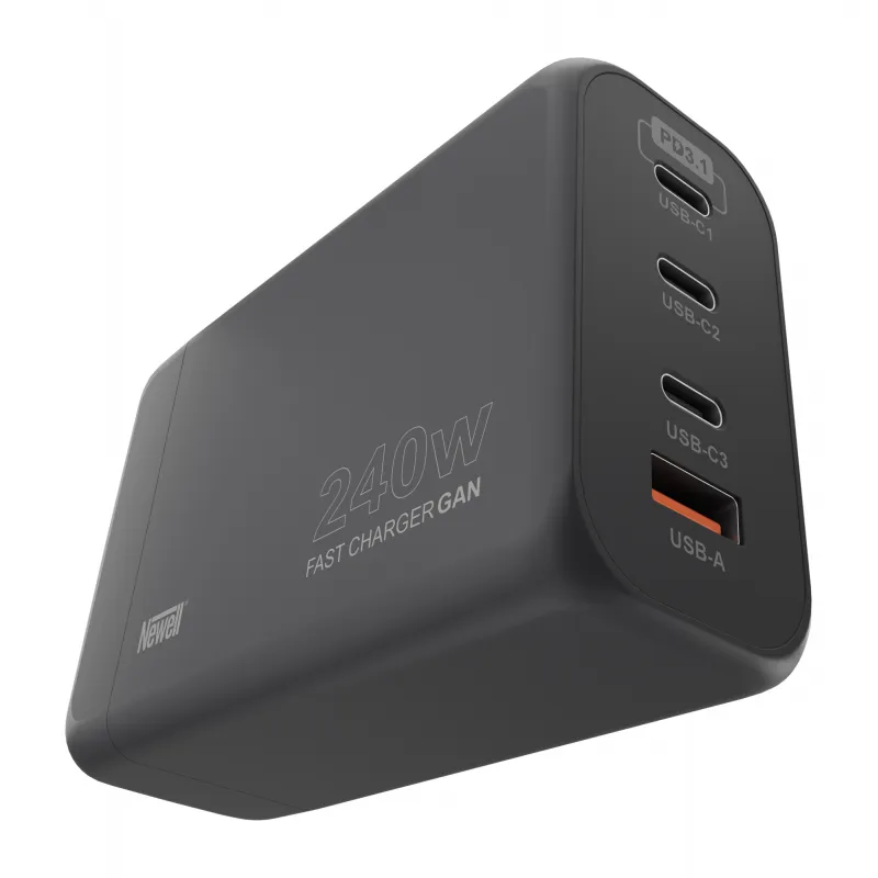 Ładowarki o dużej mocy, wykorzystywane do ładowania laptopów, potrafią zajmować sporo miejsca. Newell GaN 240 W - EU pozwoli Ci odchudzić bagaż, gdy liczy się każdy centymetr przestrzeni w Twoim plecaku lub walizce. Jedna ładowarka wystarczy, aby uzupełnić energię w Twoim podręcznym niezbędniku, składającym się np. z komputera, tabletu, smartfona i przenośnej konsoli do gier. Maksymalna moc wyjściowa wynosząca imponujące 240 W umożliwia ładowanie laptopów i bardziej wymagających urządzeń, bez konieczności sięgania po duże zasilacze z grubymi kablami.