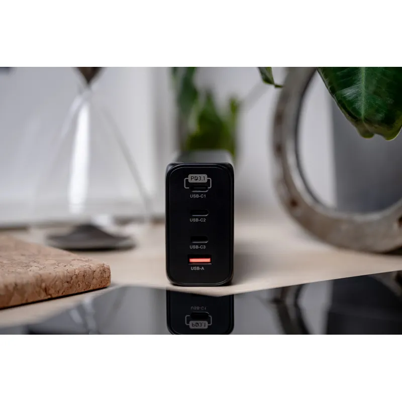 - Uniwersalna ładowarka sieciowa oferująca 3 porty USB-C oraz 1 port USB-A