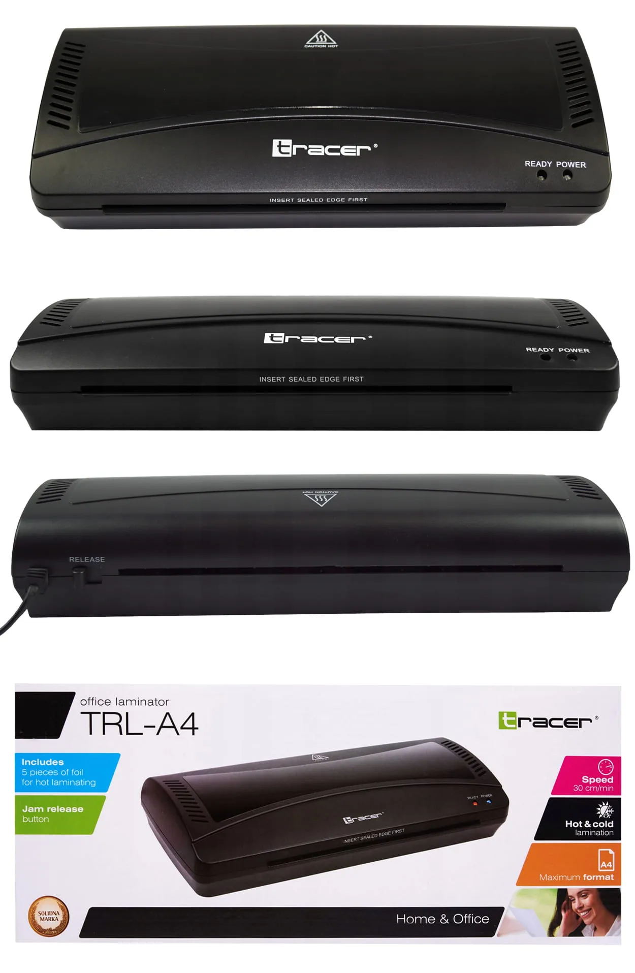 Tracer TRL-A4 to laminator przeznaczony do małego biura lub do domu. Jest to proste oraz bezpieczne w obsłudze urządzenie, o niewielkich rozmiarach, które pozwala na zgrzewanie na gorąco lub na zimno. Maksymalna szerokość laminowanego dokumentu wynosi 220 mm a maksymalna grubość folii laminacyjnej wynosi 125 mikrometrów.