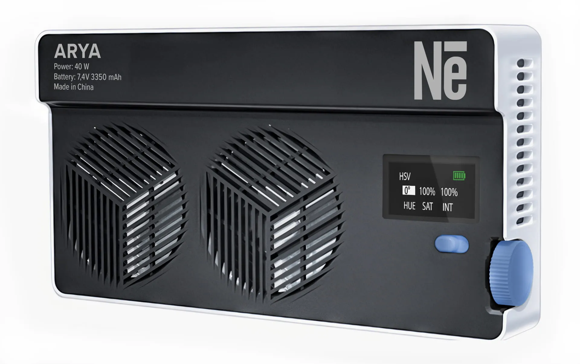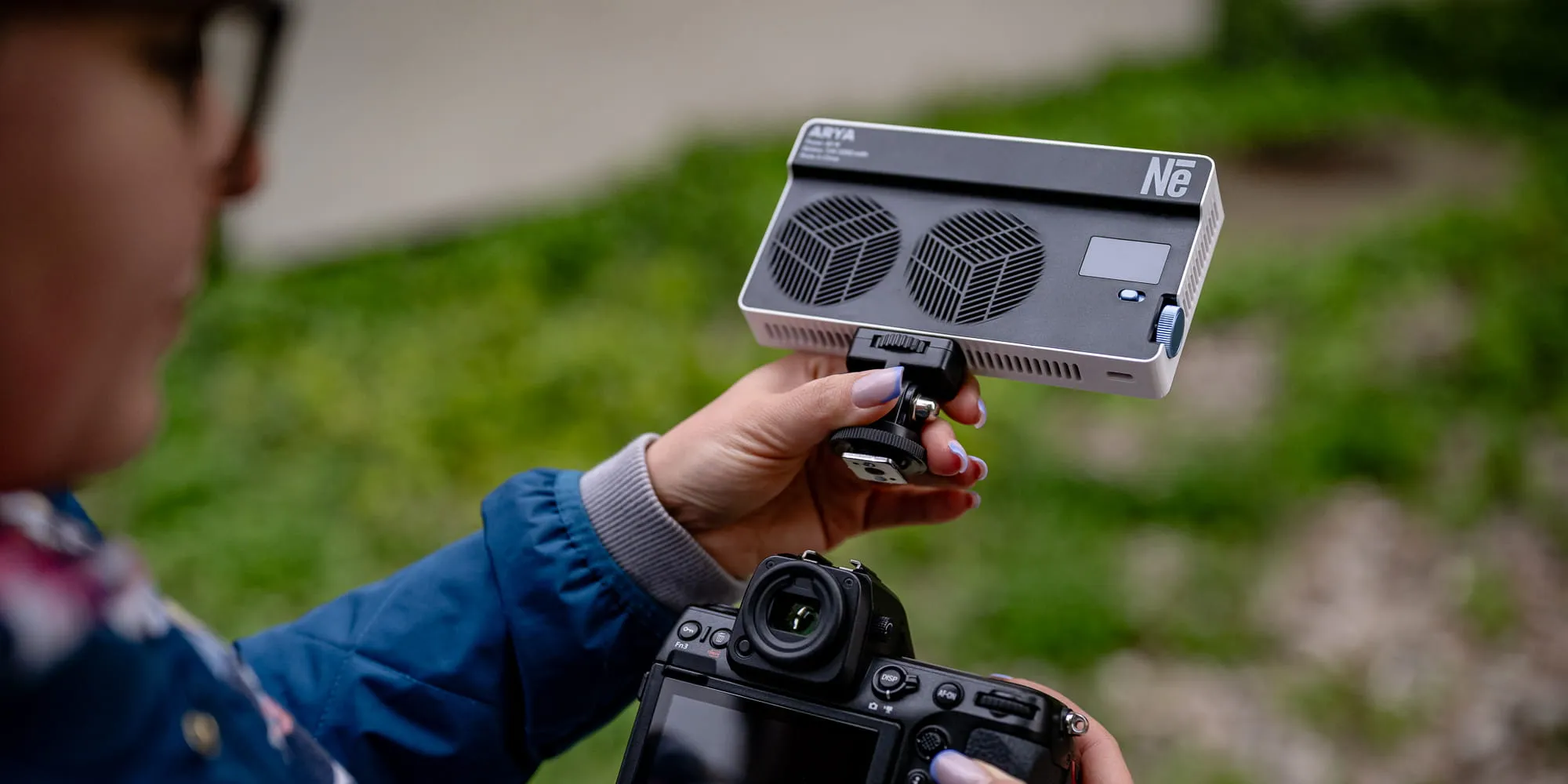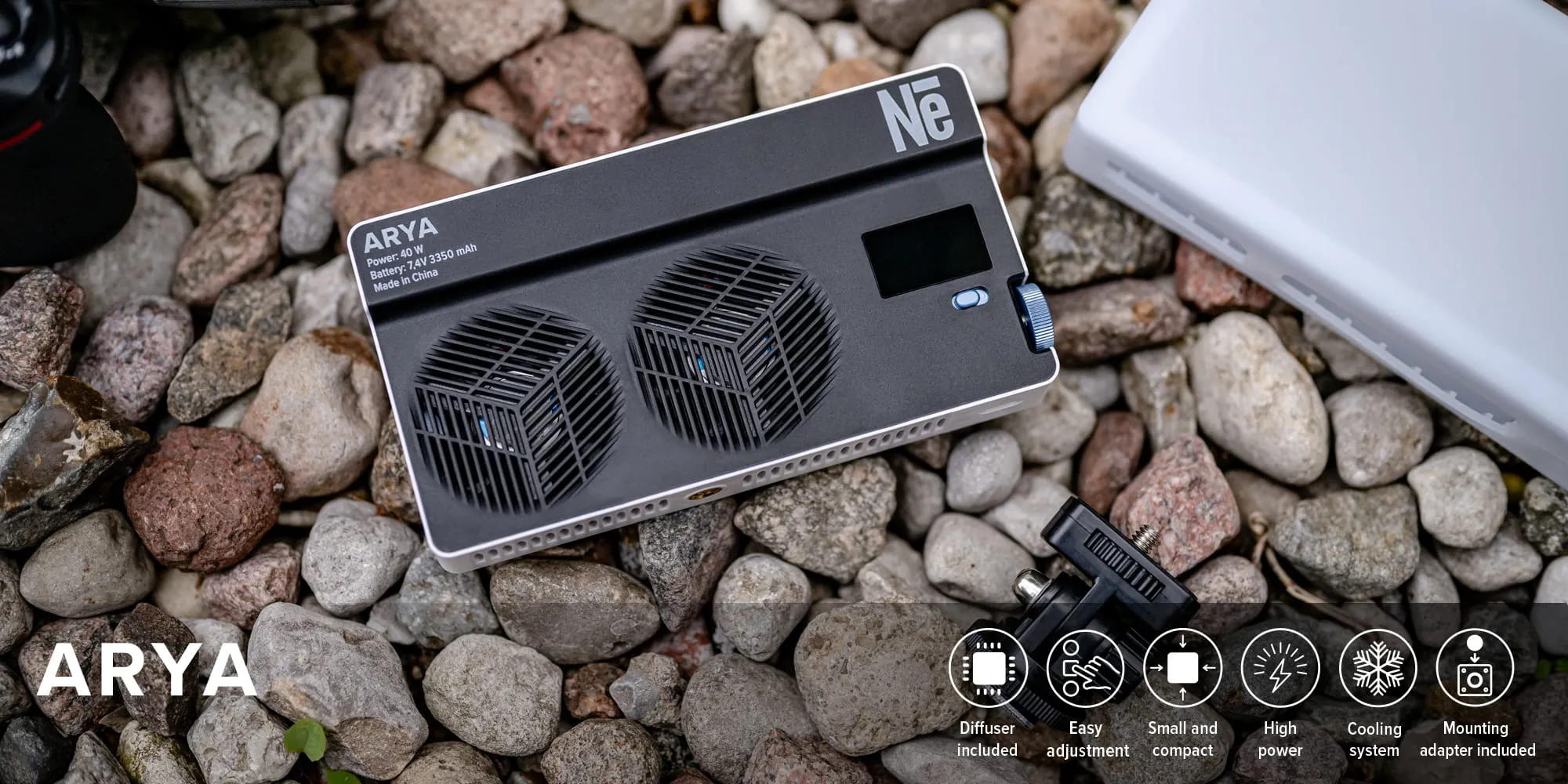 Dzięki zastosowaniu gwintu 1/4″ lampę Newell Arya RGB 40 W można z łatwością zamontować na statywie, adapterze cold shoe lub dowolnym mocowaniu. Odpowiednio wyprofilowane otwory wentylacyjne oraz umieszczony wewnątrz obudowy wentylator dbają o właściwe chłodzenie nawet podczas intensywnego użytkowania. Całość waży zaledwie 270 g, dzięki czemu lampa błyskowa Arya jest idealnym wyborem dla twórców będących w ciągłym ruchu.