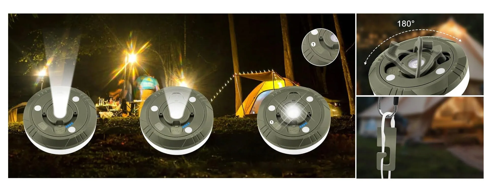 - Wielofunkcyjna lampa kempingowa z wbudowanym przewodem oświetleniowym