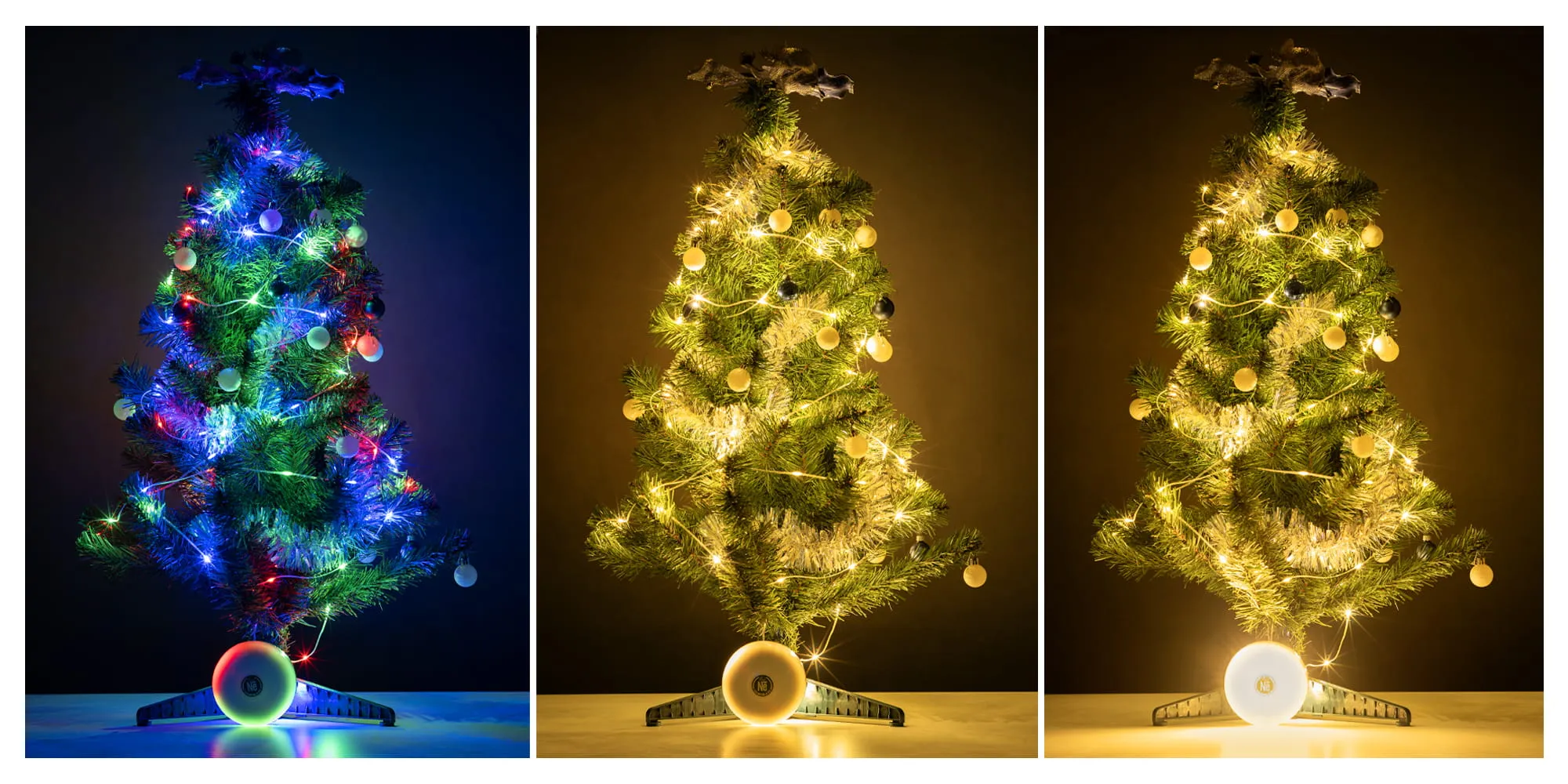 - 10-metrowy sznur świetlny z różnymi trybami świecenia: ciepłe światło, miganie RGB, ściemnianie i rozjaśnianie RGB, naturalne światło