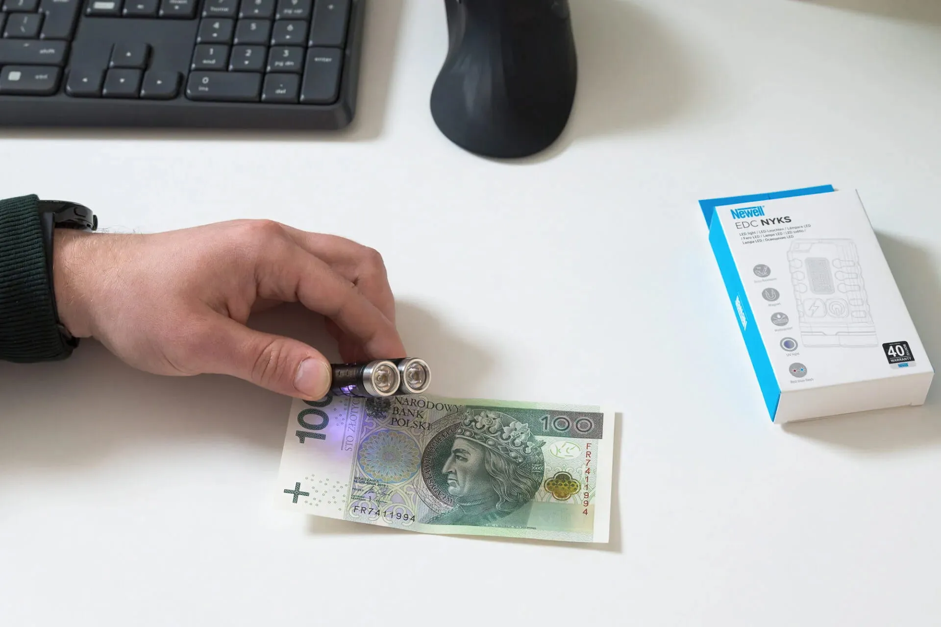 Newell EDC Nyks to nowy wymiar funkcjonalności. Dzięki zastosowaniu specjalnej diody, dostępnej z panelu bocznego, urządzenie może świecić światłem ultrafioletowym (UV). To unikalne rozwiązanie pozwala na wykorzystanie latarki na różnych polach - od wykrywania śladów po identyfikację substancji fluorescencyjnych. Ultrafiolet sprawdzi się również podczas sprawdzania autentyczności dokumentów, wykrywania plam krwi czy innych substancji.