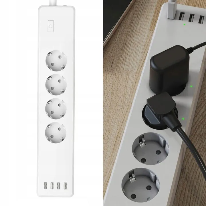 - Dzięki listwie zasilającej WLAN można inteligentnie sterować czterema urządzeniami elektrycznymi w jednym miejscu lub oddzielnie, np. kinem domowym i oświetleniem salonu, a także ładować urządzenia USB za pomocą czterech portów USB lub zasilać je energią elektryczną