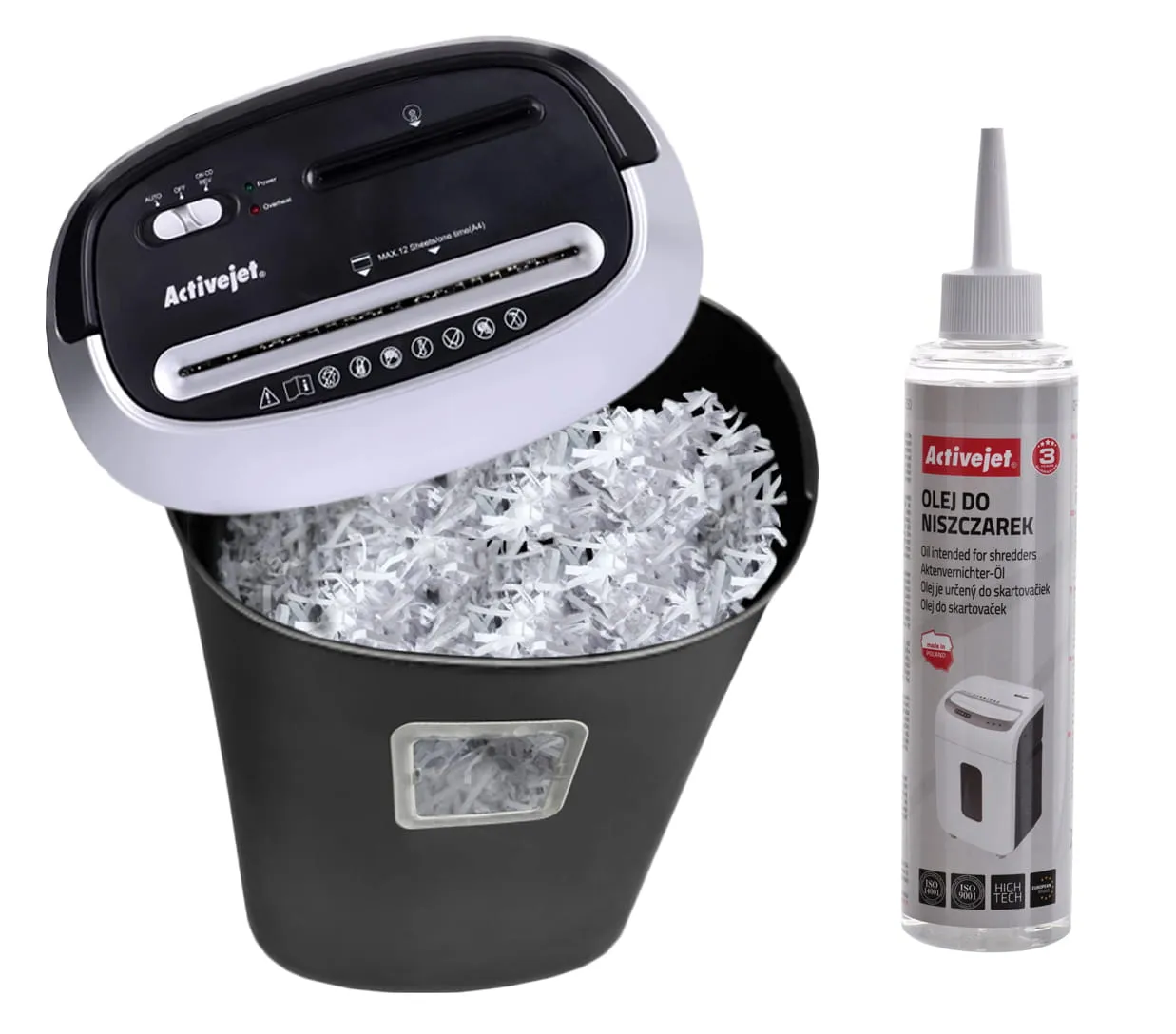 Sposób użycia: niewielką ilość oleju Activejet ASO-250 należy nanieść bezpośrednio na noże tnące lub na kartkę papieru i pociąć ją w niszczarce. Przed olejowaniem zaleca się opróżnić pojemnik.