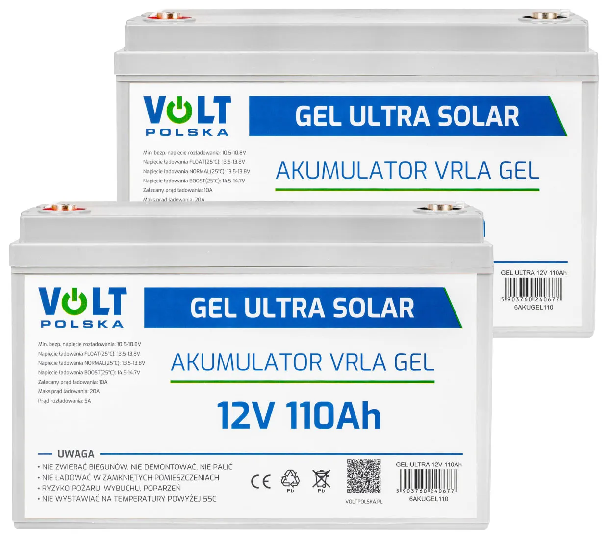 - Dwa akumulatory żelowe firmy Volt Polska GEL VPRO Premium 12V 110Ah