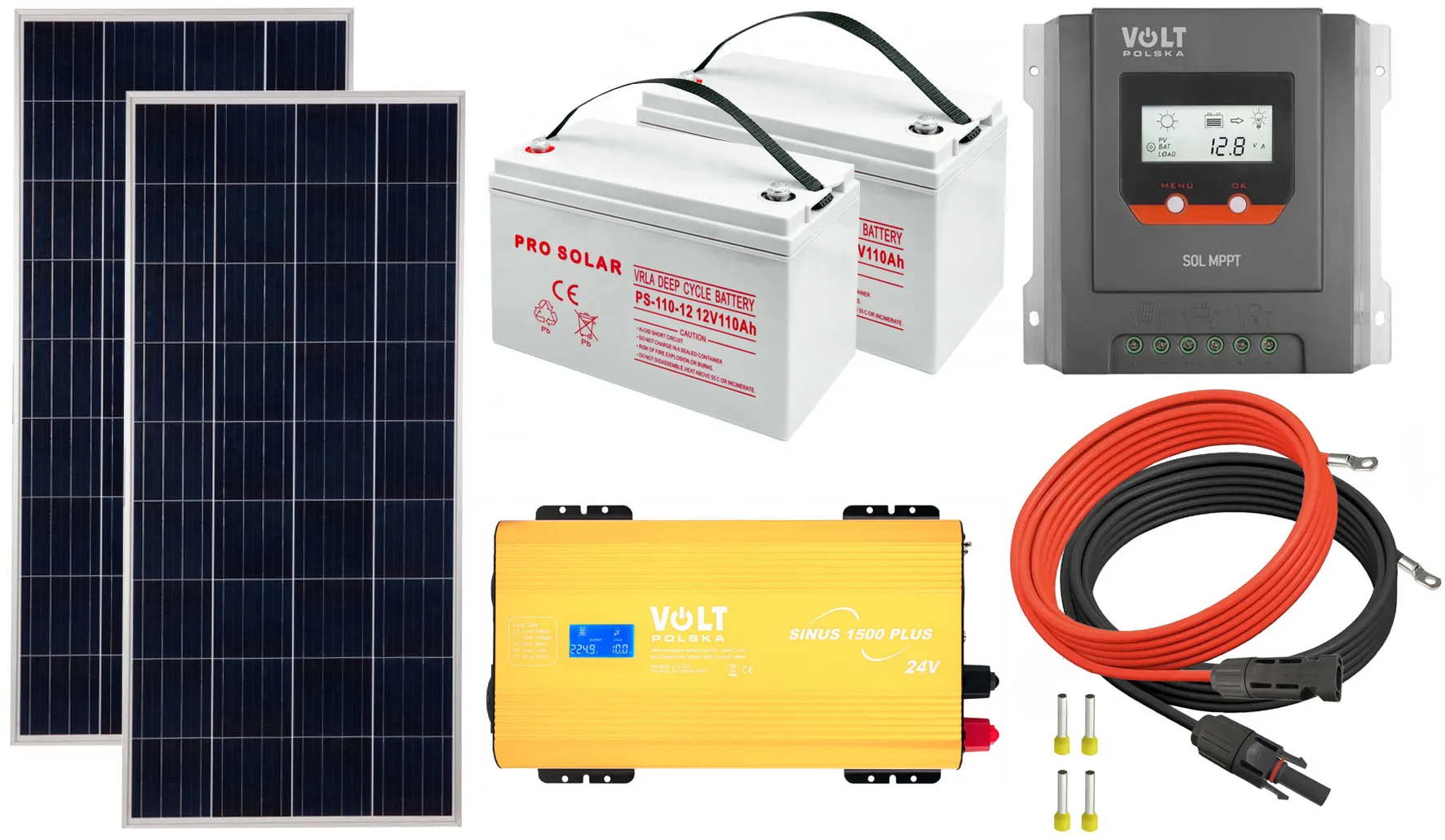 - Dwa panele fotowoltaiczne Volt Polska POLI 180W 18V [1480 x 670 x 35 x 30 mm] + przewód MC4