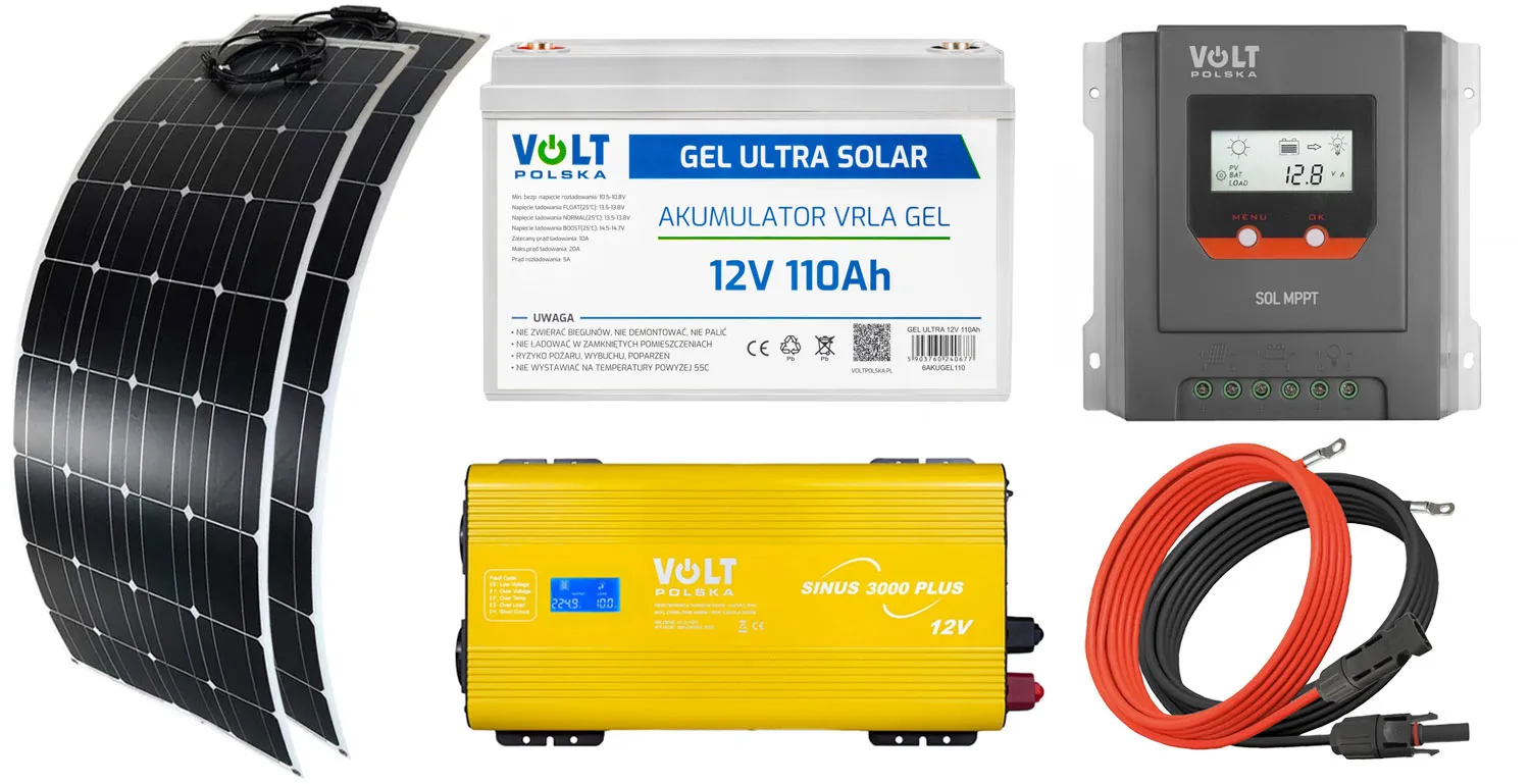 - Dwa panele fotowoltaiczne elastyczne Volt Polska MONO FLEX 100W 18V [1080 x 540 x 4 mm] + przewód MC4