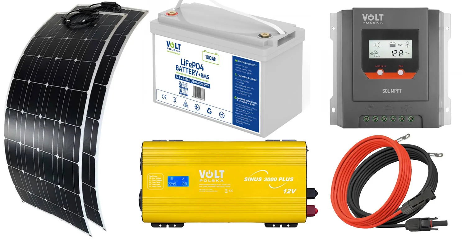 - Dwa panele fotowoltaiczne elastyczne Volt Polska MONO FLEX 100W 18V [1080 x 540 x 4 mm] + przewód MC4