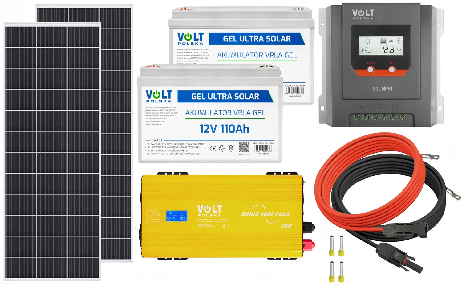 - Dwa panele fotowoltaiczne Volt Polska MONO 220W 19.5V [1480 x 670 x 35 x 30 mm] + przewód MC4