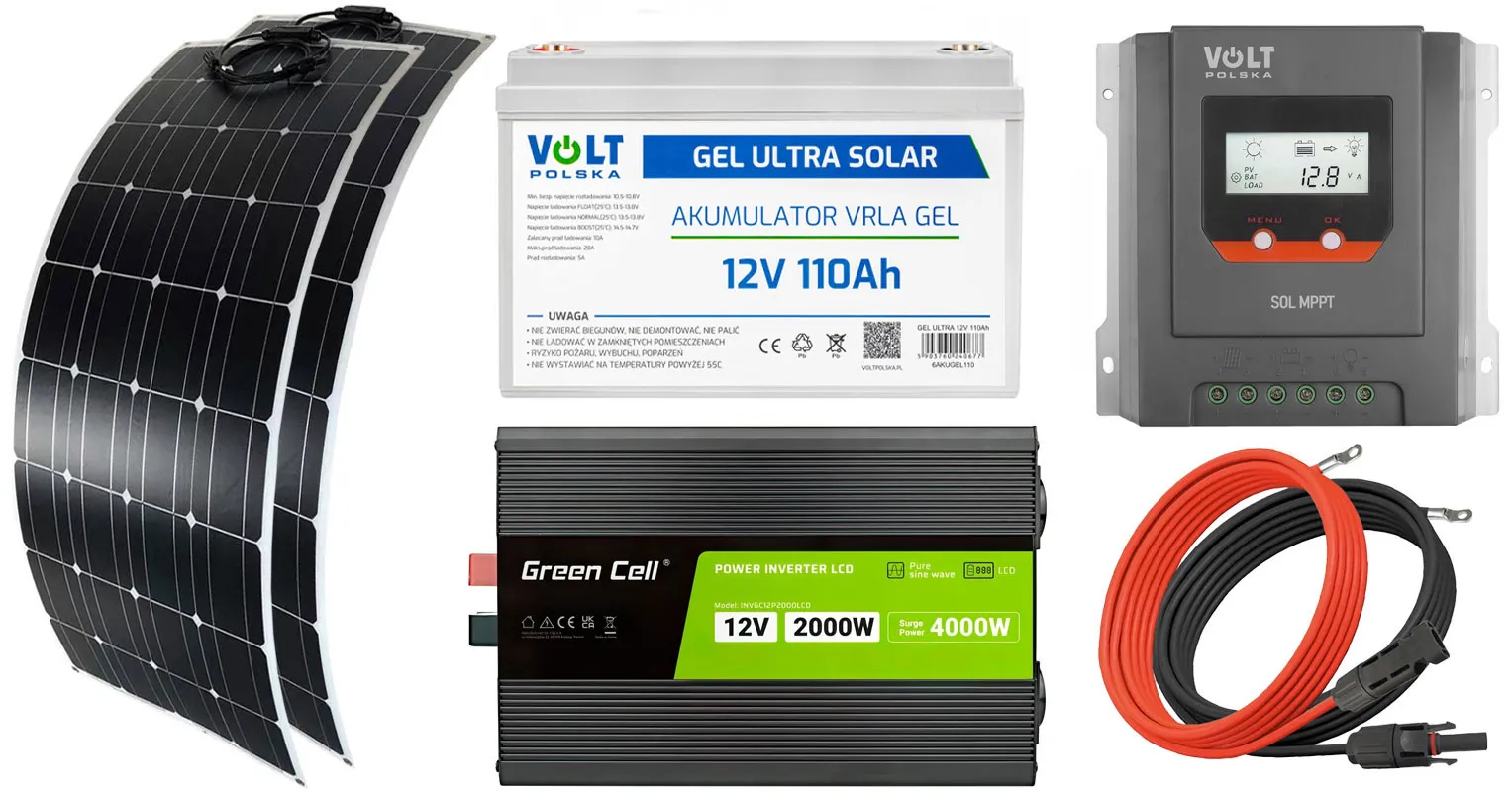 - Dwa panele fotowoltaiczne elastyczne Volt Polska MONO FLEX 100W 18V [1080 x 540 x 4 mm] + przewód MC4