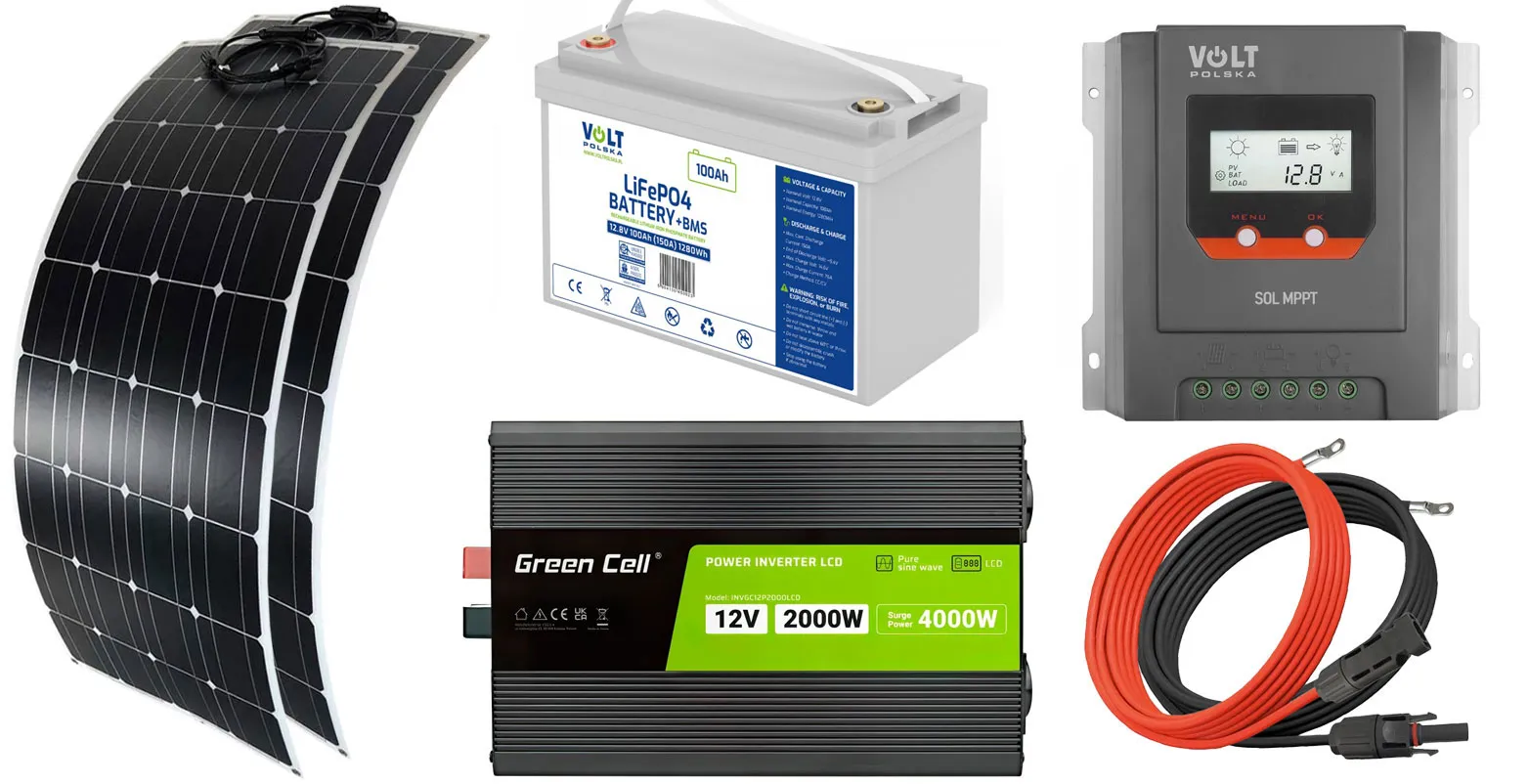 - Dwa panele fotowoltaiczne elastyczne Volt Polska MONO FLEX 100W 18V [1080 x 540 x 4 mm] + przewód MC4