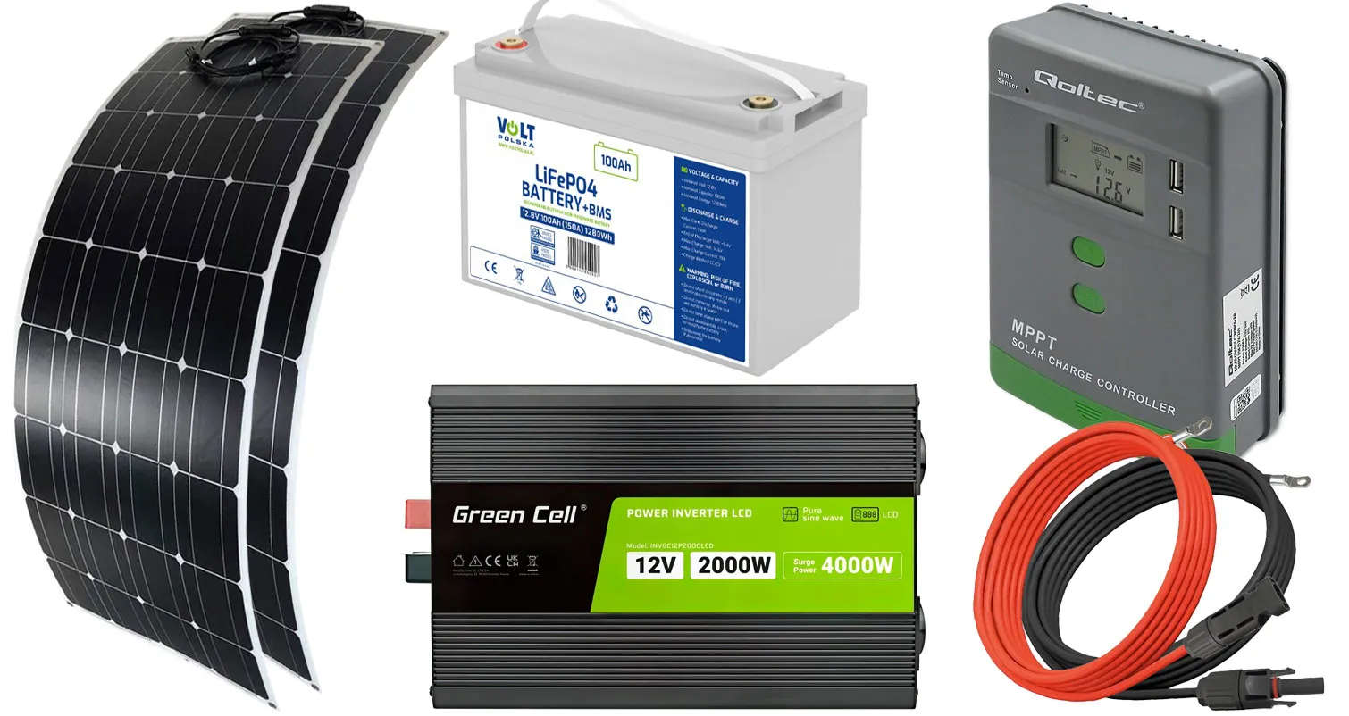 - Dwa panele fotowoltaiczne elastyczne Volt Polska MONO FLEX 100W 18V [1080 x 540 x 4 mm] + przewód MC4