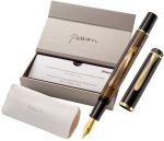 Pióro wieczne Classic to ponadczasowy design, którego korpus i skuwka wykonane są w kolorze czarnym i brązowym. Różne odcienie brązu nadają charakterystycznego wyglądu, który przypomina lśniący marmur. Dekoracyjne okręgi pozłacane 24-karatowym złotem, charakterystyczny klips w kształcie dziobu pelikana podkreślają jego tradycyjny charakter.