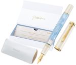 Pióro wieczne Classic to ponadczasowy design, którego korpus i skuwka wykonane są w kolorze białym i niebieskim. Różne odcienie niebieskiego nadają charakterystycznego wyglądu, który przypomina lśniący marmur. Dekoracyjne okręgi pozłacane 24-karatowym złotem, charakterystyczny klips w kształcie dziobu pelikana podkreślają jego tradycyjny charakter.