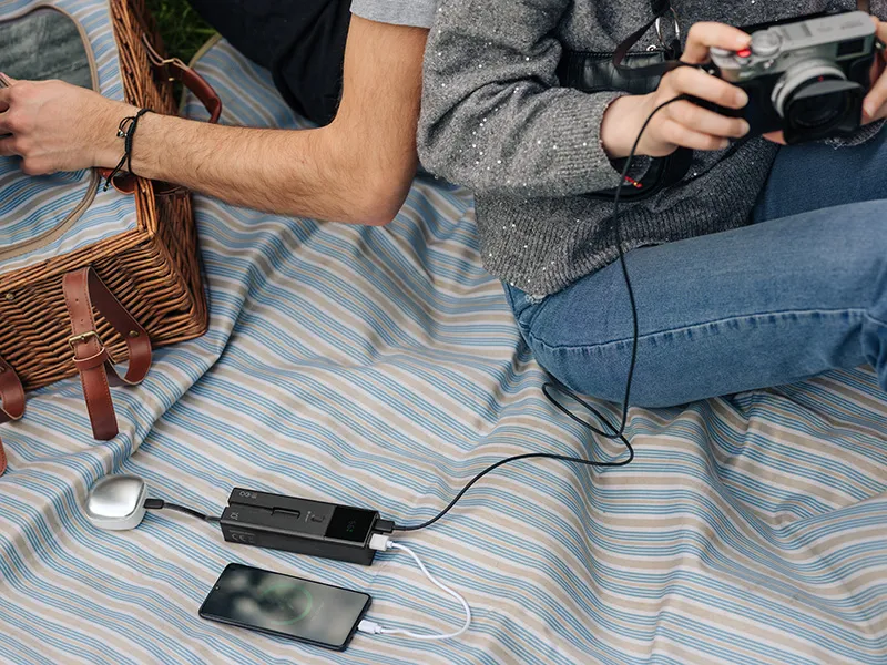 Powerbank posiada wbudowany kabel USB-C o mocy 100W zarówno na wyjściu, jak i wejściu, co eliminuje konieczność noszenia dodatkowych przewodów. Dzięki temu możesz szybko i wygodnie podłączyć swoje urządzenie, niezależnie od miejsca i sytuacji.