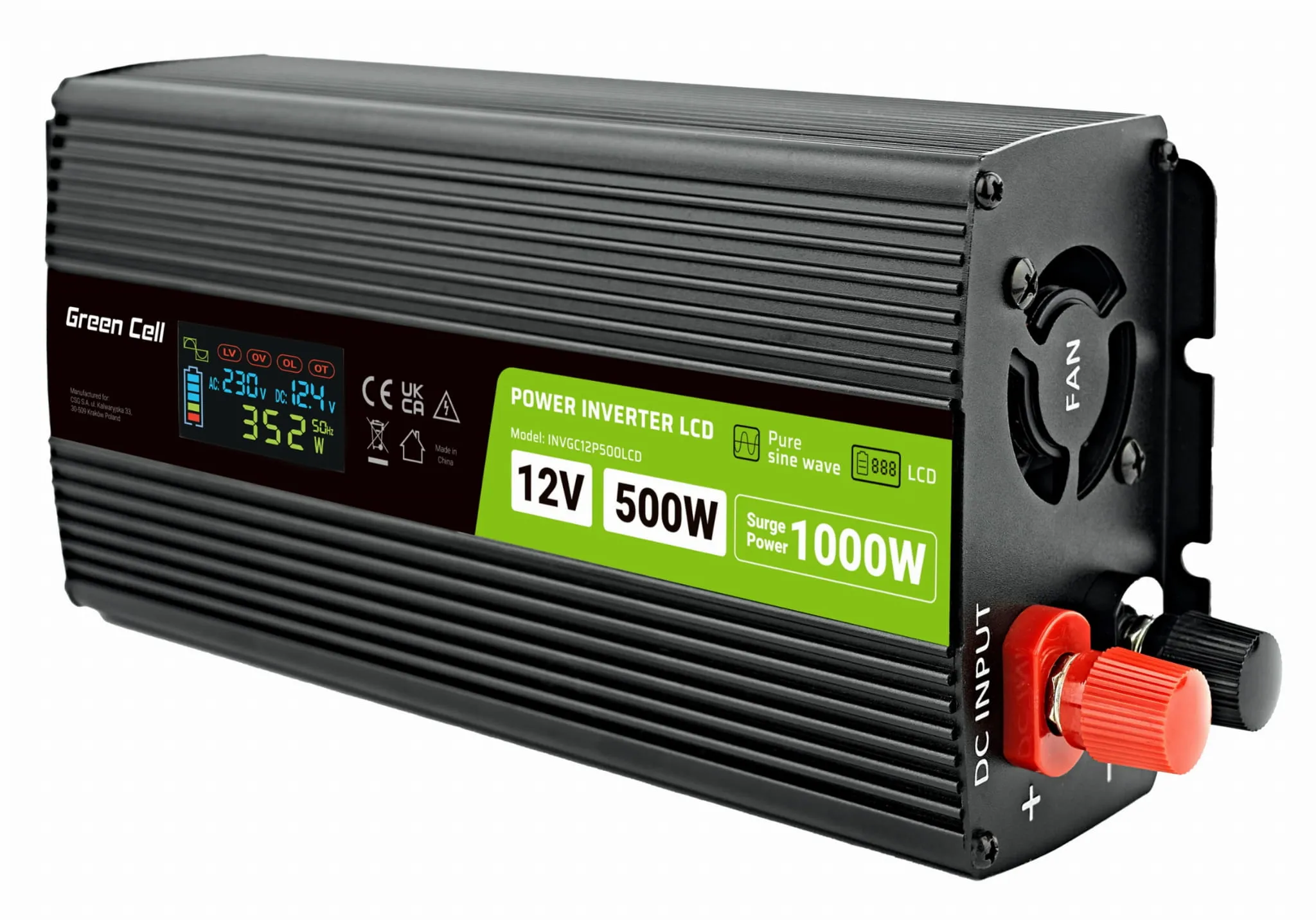 - Przetwornica napięcia Green Cell PowerInverter Czysty sinus z wyświetlaczem 12V 500W/1000W