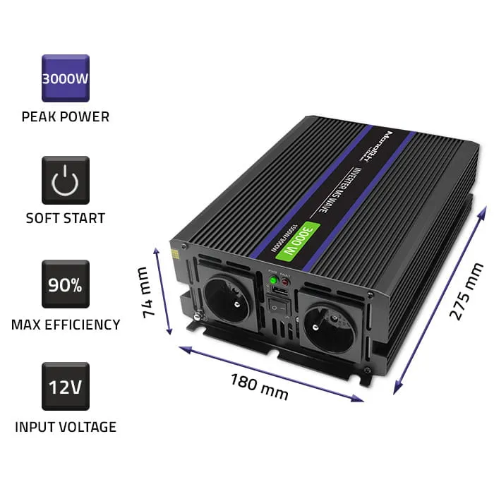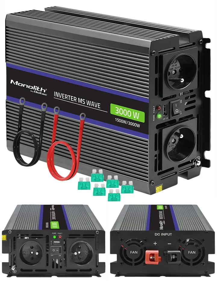 - Przetwornica napięć Qoltec Monolith 3000 modyfikowany sinus 1500/3000W 12V/230V USB